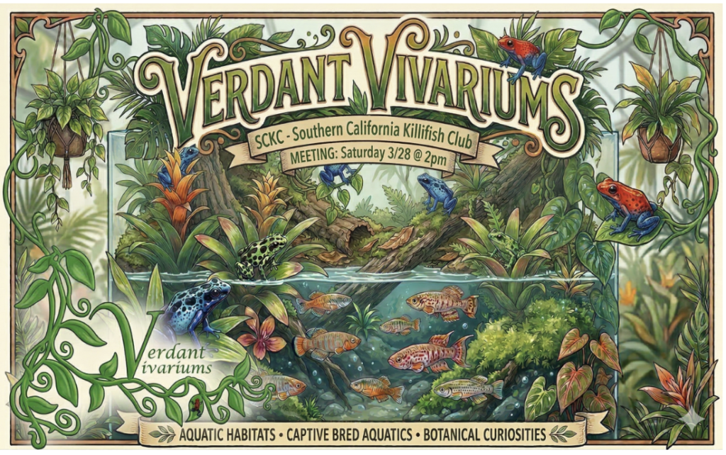 This will be a great opportunity to check out the new shop and catch up. Verdant Vivariums primarily focuses on terrestrial plants, but has dart frogs and some fish on display.